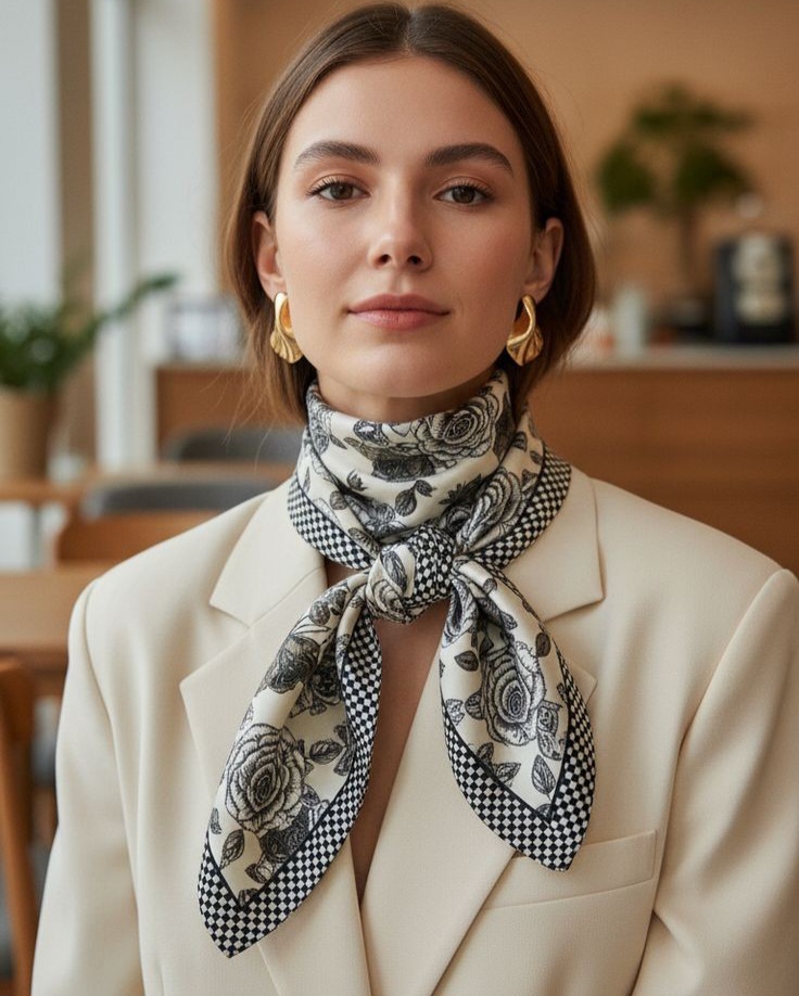 روسری را به شکل نواری باریک تا کنید، دور گردن بیندازید و یک گره کوچک در جلو یا کنار گردن بزنید.