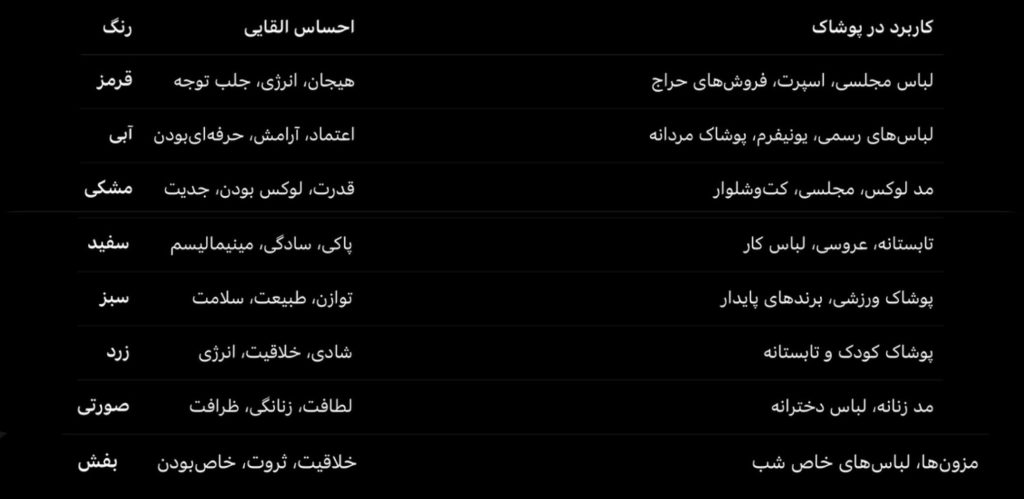 مشتریان لباس مشکی، طلایی و سرمهای را در دسته گرانتر و لوکستر تصور میکنند. رنگهایی مثل نارنجی یا سبز روشن معمولاً قیمت متوسط یا اقتصادی القا میکنند.